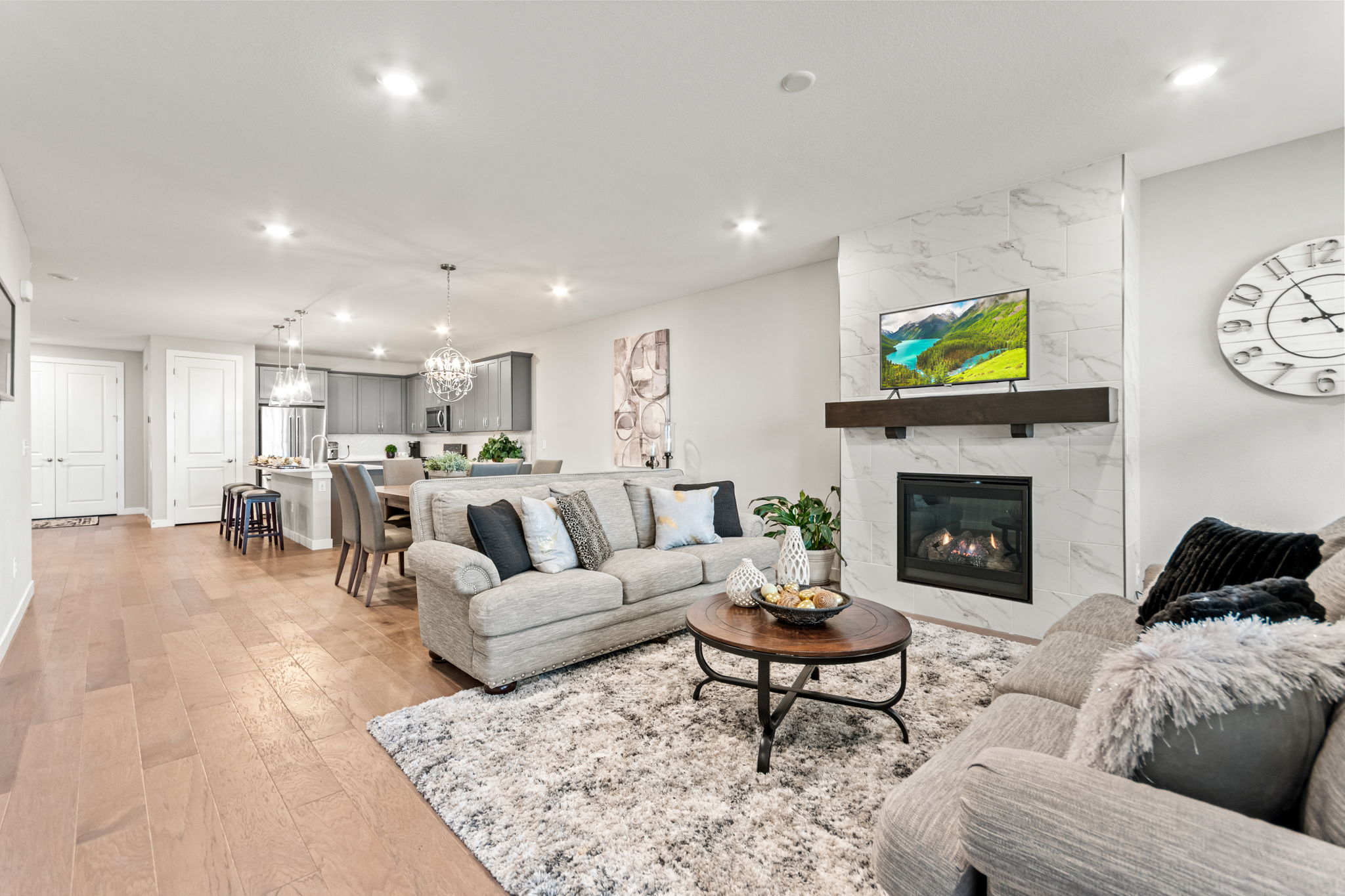 At the heart of the home is chef-inspired kitchen featuring a large center island with quartz countertops, stainless steel appliances, and abundant updated grey cabinetry. The open-concept design flows into a light-filled great room, creating a warm, inviting space to gather.